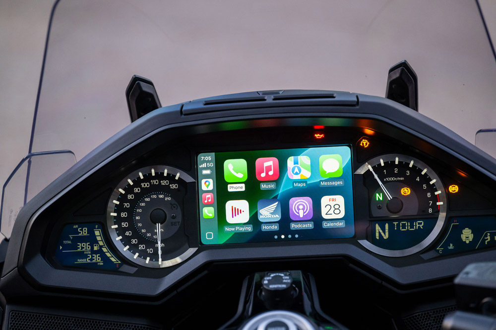 Even though I don’t own a vehicle equipped with Apple CarPlay or Android Auto, I found the Wing’s infotainment system works well. It was easy enough to use (though I hardly took advantage of what it all has to offer), and the initial setup was simple, but, of course, not without some of the usual little hiccups when hooking up any electronic device for the first time. Luckily, once you’ve accomplished it, connecting from then on out is easy. Since I have little experience with the Gold Wing’s previous infotainment center, Honda reps assured me the new one is more streamlined than before. Of note, the new system does not incorporate a built-in navigation system; instead, you’ll rely on your smartphone’s GPS app for that now.