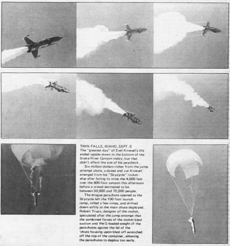Lift-off…and let down. After years of foreplay, the stunt of the century fizzled as America watched Knievel and his limping Skycycle X-2 parachute down into a humiliating bonk on the rim of the canyon.