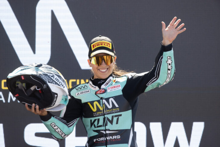 A highly combative finish to the second WorldWCR race at Cremona saw Maria Herrera (Klint Forward Racing Team) hold off a hard attempted pass from eventual third place rider Beatriz Neila (Ampito Crescent Yamaha) to take her second race win of 2025. Roberta Ponziani (Klint Forward Racing Team) was finally the second placed rider.