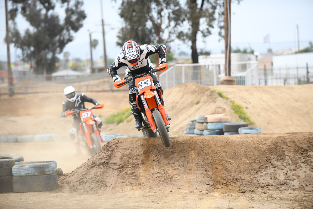 Later in the day, I was given the go-ahead to take former AMA Supermoto Champion Chris Fillmore’s recently built racer for a spin. Based on the 2025 SMR, Fillmore’s weapon had pretty much everything possible done to it, including full factory WP suspension, triple clamps, engine work, twin-disc front brakes, a 30mm shorter swingarm and a 16-inch front wheel.